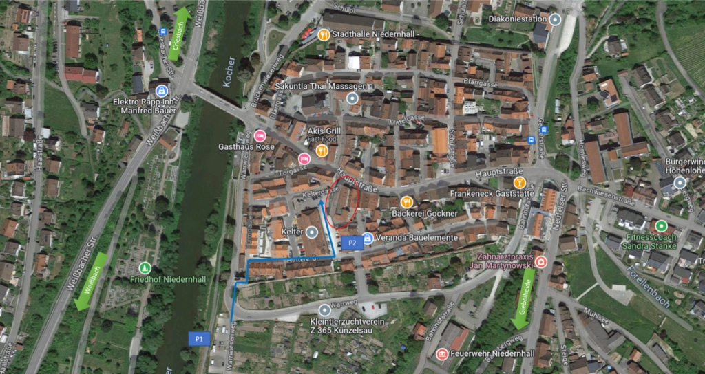 Der Parkplatz (P1) direkt am Kocher bietet ausreichend Platz und über den beschriebenen Weg auf dem Bild sind es nur 230m bis zum Standesamt.
